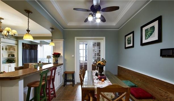 客厅作为待客区域,一般要求简洁明快,同时装修较其它空间要更明快光鲜 ,通常使用大量的石材和木饰面装饰;美国人喜欢有历史感的东西,这不仅反映在软装摆件上对仿古艺术品的喜爱,还反映在背景墙的整体效果上。