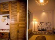 混搭中式,土窑烧出的文化砖人字贴砌出斑驳的感觉,实木电视台面由两个柱头和若干老灰砖撑起,分量感很重,竹子吊灯里黄色的灯光洒满整个空间。