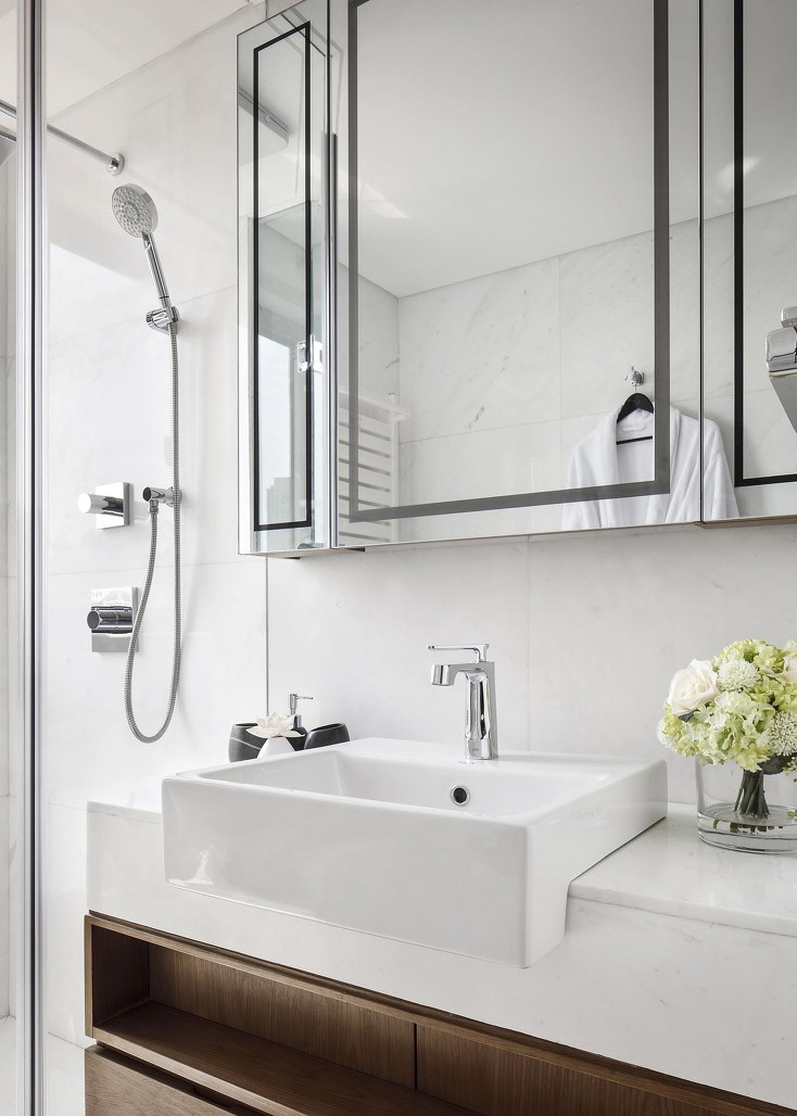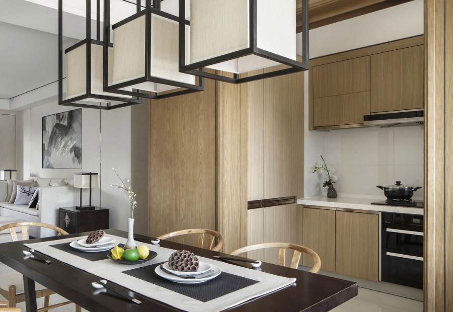 天青色等烟雨,泼墨了无期。水墨并非黑白,客厅用青瓷和干墨诉说了水墨故事。开放式格局中,空间之中互有联系。除了墨,还有木。老式太师椅和木质门洞隔断,在温润中体现了中华美食的力量。