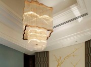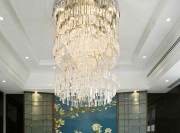 一楼的屋高满足了大气的场景效果,精致秀丽的巨幅花卉图成为了客厅视觉的中心。配套的家居软装温馨而唯美,玻璃茶几构造极具创意,利用建筑学的原理构筑了简约而精致的小风景。铁皮包覆的餐桌质感和深色原木餐椅有着别样的和谐,中央的水晶吊顶凸显了高贵的生活追求。
