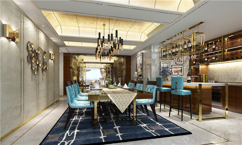 别墅客厅的高大是一个基本特征,装修好别墅客厅的背景墙就显得尤为重要,这里的背景墙非常连贯和高贵。客厅吊顶方方正正,吊顶的水晶吊灯尽显奢华富贵,把整个客厅都照亮了,波幔窗帘符合新古典风格的装饰。