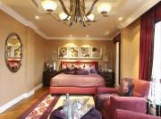 客厅里L型沙发摆放贴合整个客厅的空间格局,金黄色的吊灯和黄色沙发配的很和谐,酒红色落地窗帘,尽显大方。餐厅独立在一个空间,酒红色的餐椅显得特别高端大气上档次。餐桌上的摆设也很精致高档,尽显华贵气质。
