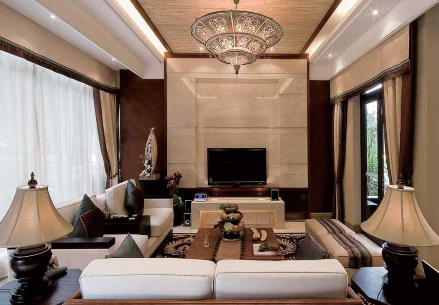 客厅背景墙由米色大面积方形大理石装饰,与客厅里米色沙发、窗帘形成呼应,典雅别致。餐厅吊顶采用双层环形剪纸图案水晶灯,古色古香的同时又增添一丝奢华的味道。厨房与餐厅由吧台隔开,形成半开放格局,布局巧妙,视野开阔。